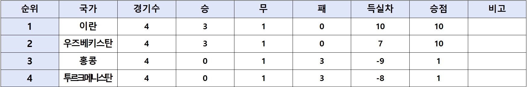 이란, 우즈베키스탄, 홍콩, 투르크메니스탄이 조를 이루어 경기를 진행했으며, 이란이 투르크메니스탄을 1대0으로 이기면서 조 1위를 유지하였고, 우즈베키스탄도 홍콩을 3대0으로 이기면서 조 2위를 유지하였습니다.