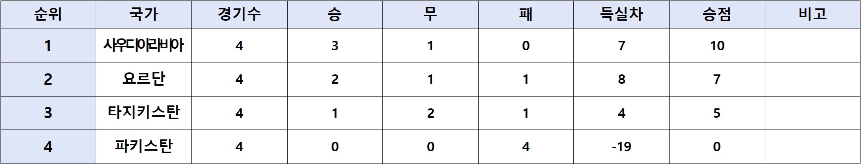 사우디아라비아, 타지키스탄, 요르단, 파키스탄이 조를 이루어 경기를 진행했으며, 사우디아라비아와 타지키스탄은 1대1로 무승부를하여 사우디아라비아는 조 1위를 유지하였고, 요르단이 파키스탄을 7대0으로 이기면서 조 2위로 올라왔습니다.
