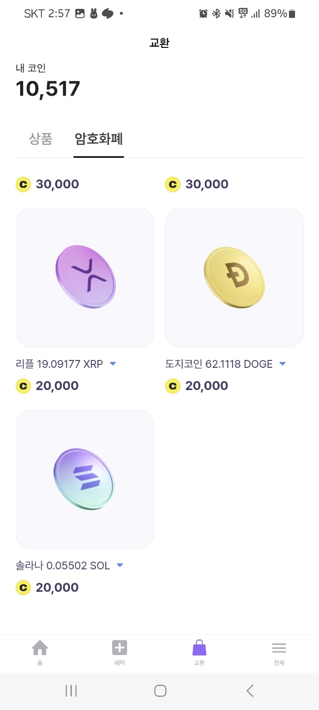먼저, 어플 하단 교환 탭을 클릭한 후 암호화폐를 클릭하면 교환할 수 있는 코인이 표시됩니다.
