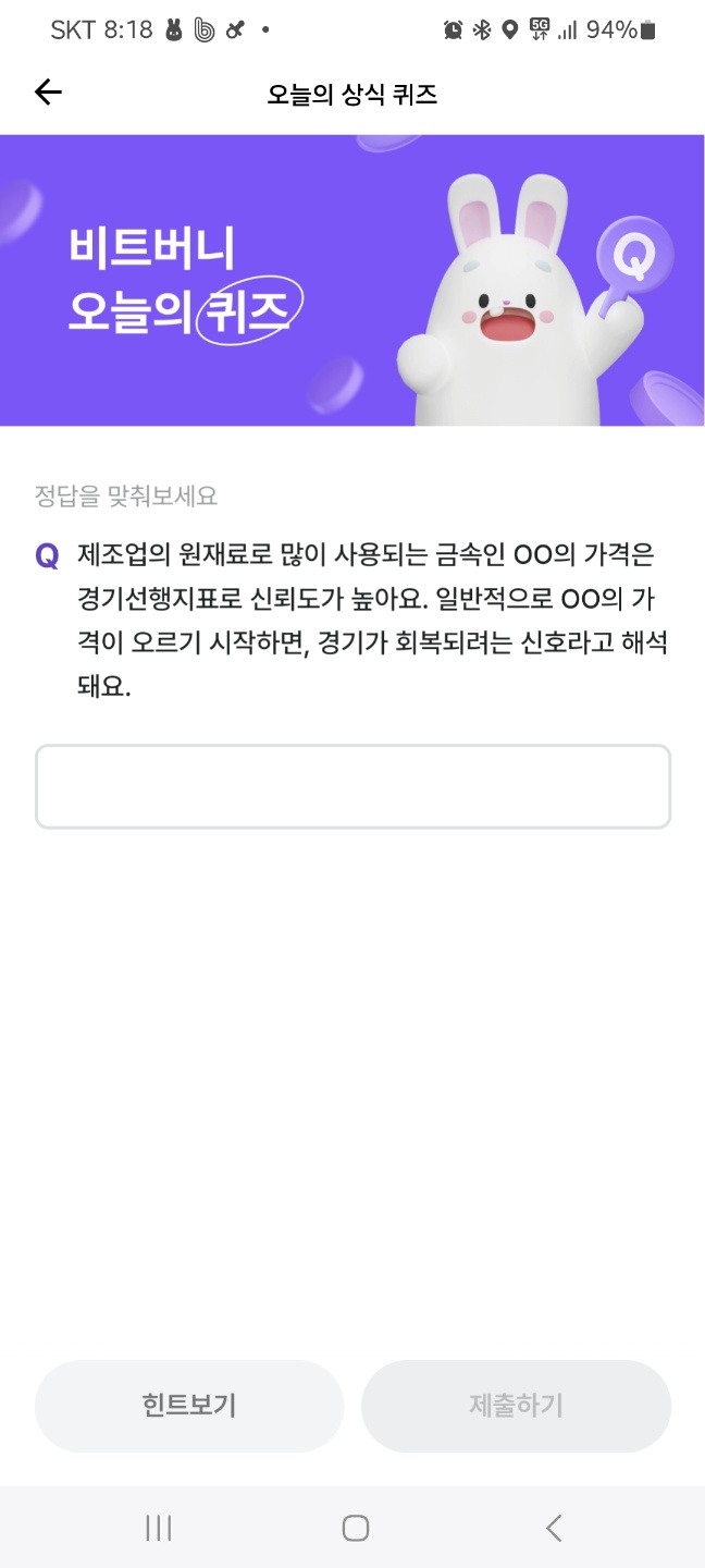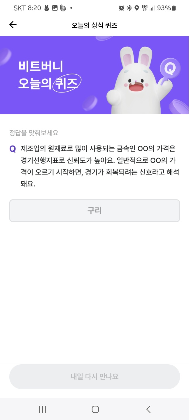 비트버니 퀴즈 문제. 제조업의 원재료로 많이 사용되는 금속인 OO의 가격은 경기선행지표로 신뢰도가 높아요. 일반적으로 OO의 가격이 오르기 시작하면, 경기가 회복되려는 신호라고 해석돼요.