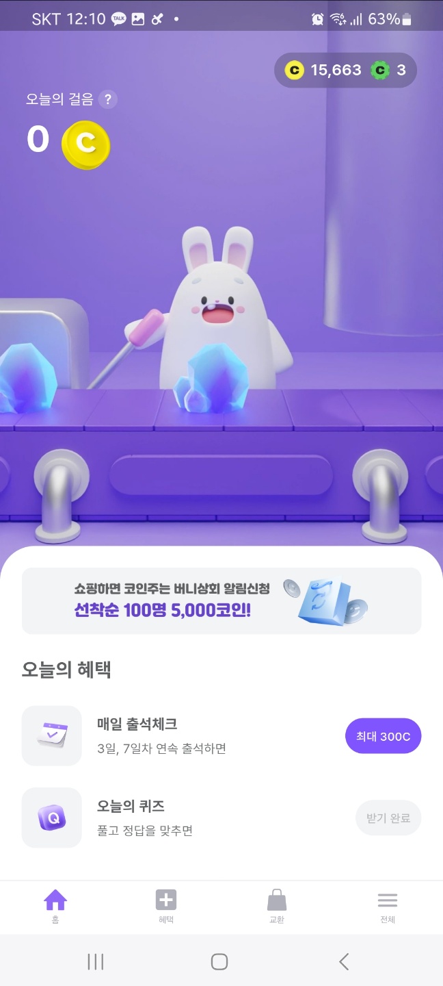오늘의 걸음의 경우 걷는 만큼 코인을 모을 수 있으며, 오늘이 지나면 받지 않은 코인은 사라지니 놓치지 말고 꼭 코인을 눌러서 받아주세요!