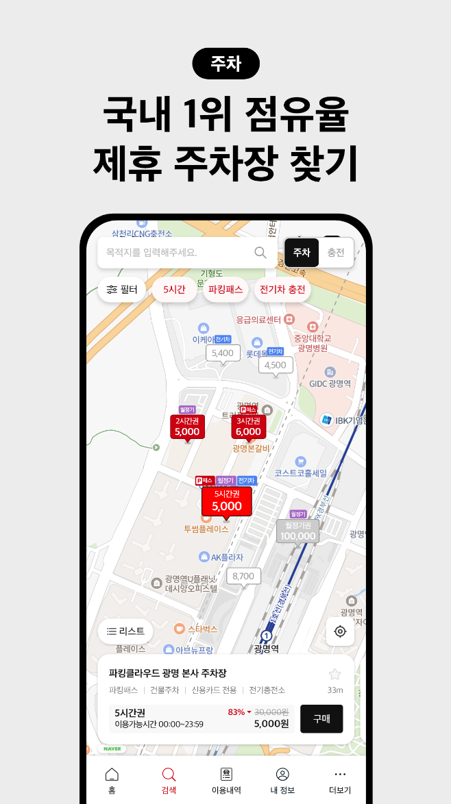 - 검색 화면에서 ‘내 위치’ 버튼을 누르면 자동으로 주변 주차장을 탐색하여 가장 가까운 주차장들을 추천해 주기 때문에, 복잡한 도심에서도 빠르게 주차할 수 있습니다.